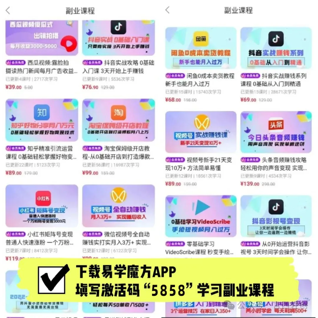 上面有400多个精品副业教程,均为正版课程,随便一部外面2000元起步!无需下载超高清在线播放,有闲鱼卖货、小红书卖虚拟产品、拼多多开店、短视频赚钱、各种精品引流课程...你想学的副业,上面全部都齐了!(下载易学魔方APP,输入激活码5858)
