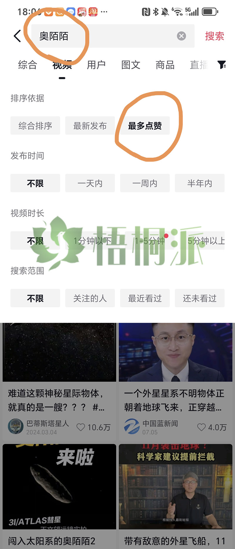 就像最近大家都在聊 “天外来客奥陌陌”,我就以这个话题举例子:搜 “奥陌陌” 关键词,点 “点赞最多”,再挑一个最近发布、点赞量最高的视频 —— 这样的视频,本身就自带流量,咱们拿它的文案来改,起点就比别人高。