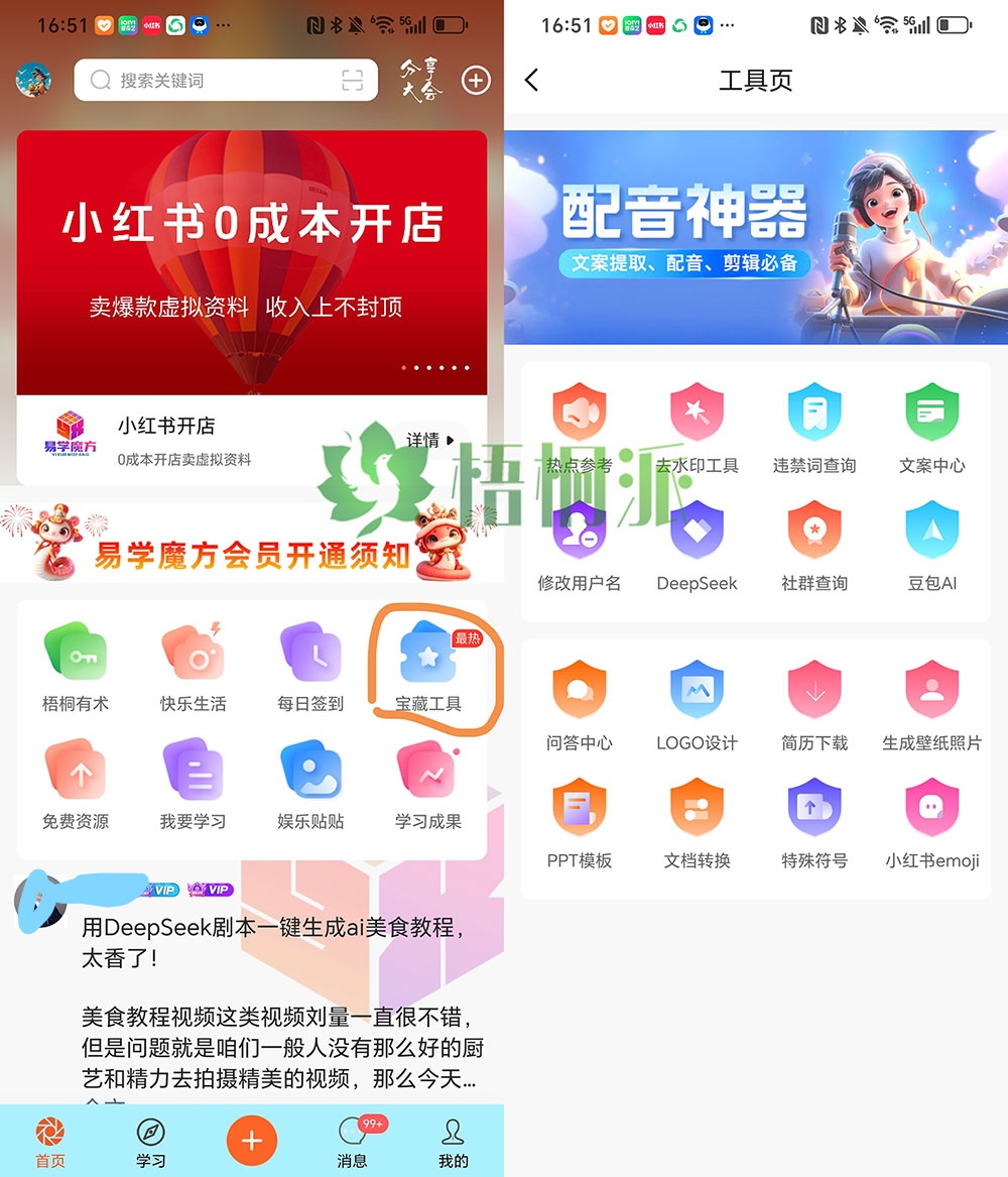易学魔方 “宝藏工具”:要是你记不住前面两个工具的名字,就打开易学魔方 APP,激活码:5858 能薅到注册名额,在 “宝藏工具” 版块里找 —— 里面直接有配音神器的入口,不用再单独搜网址。咱们魔方的这个工具区真的很实用,平时找其他辅助工具也能在这儿翻一翻。